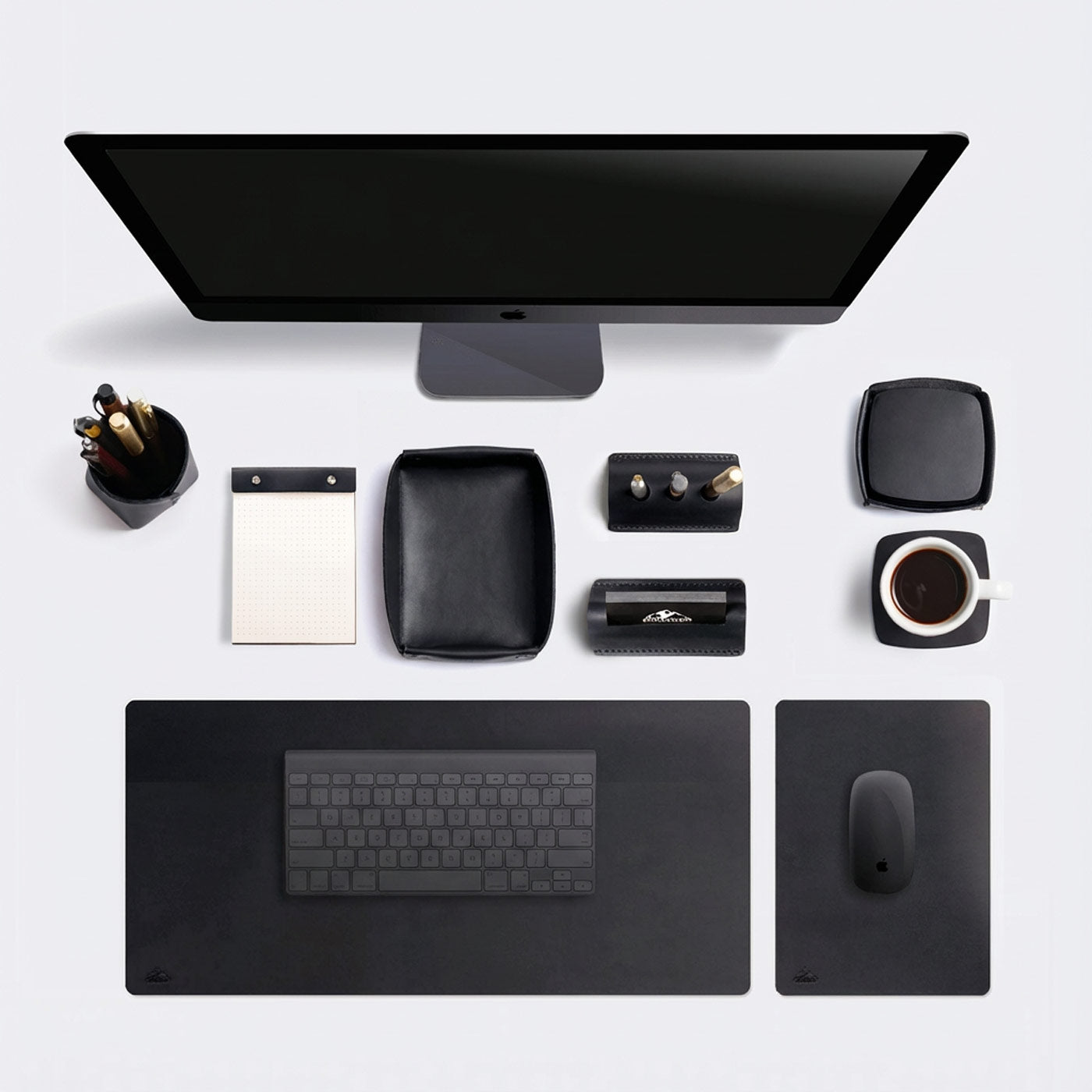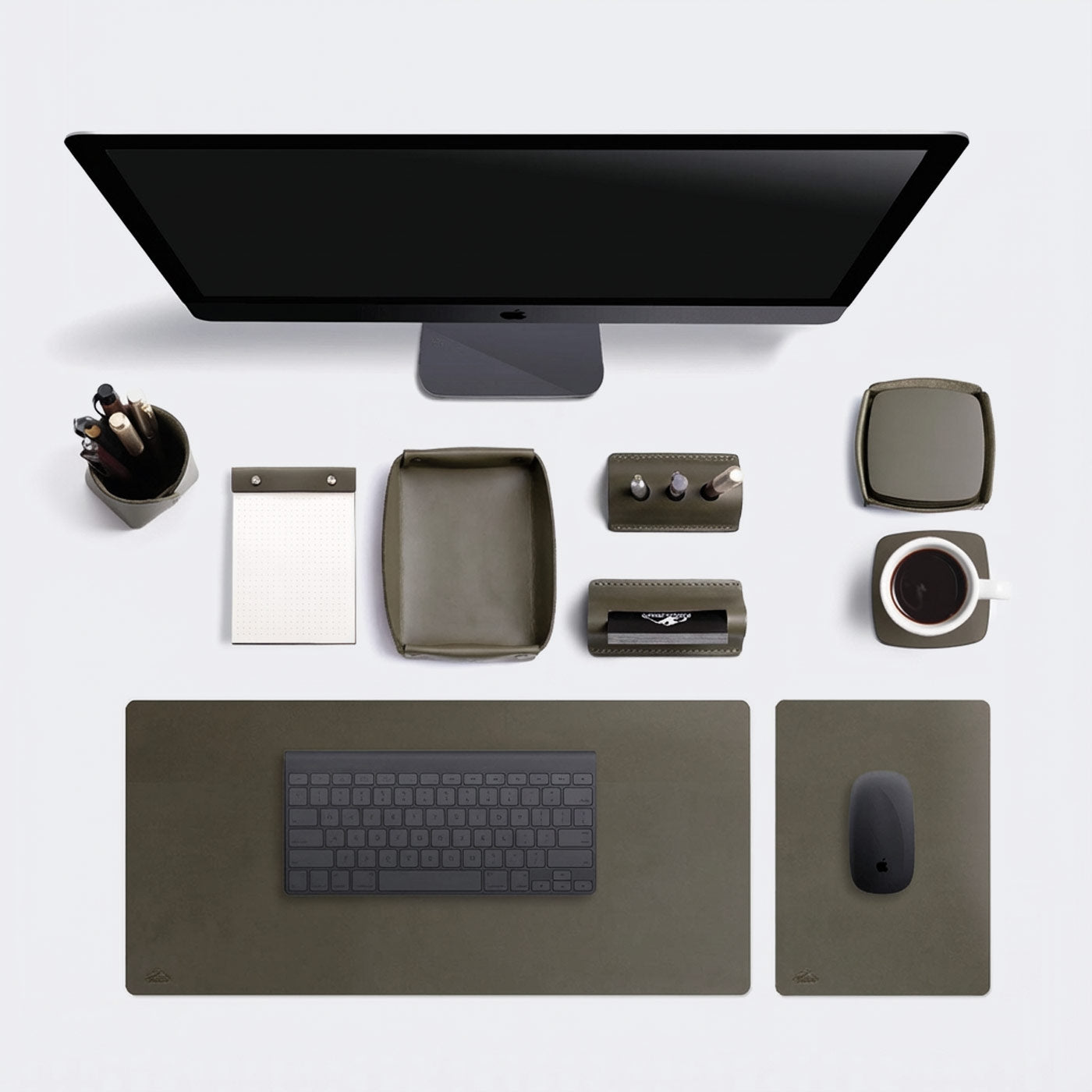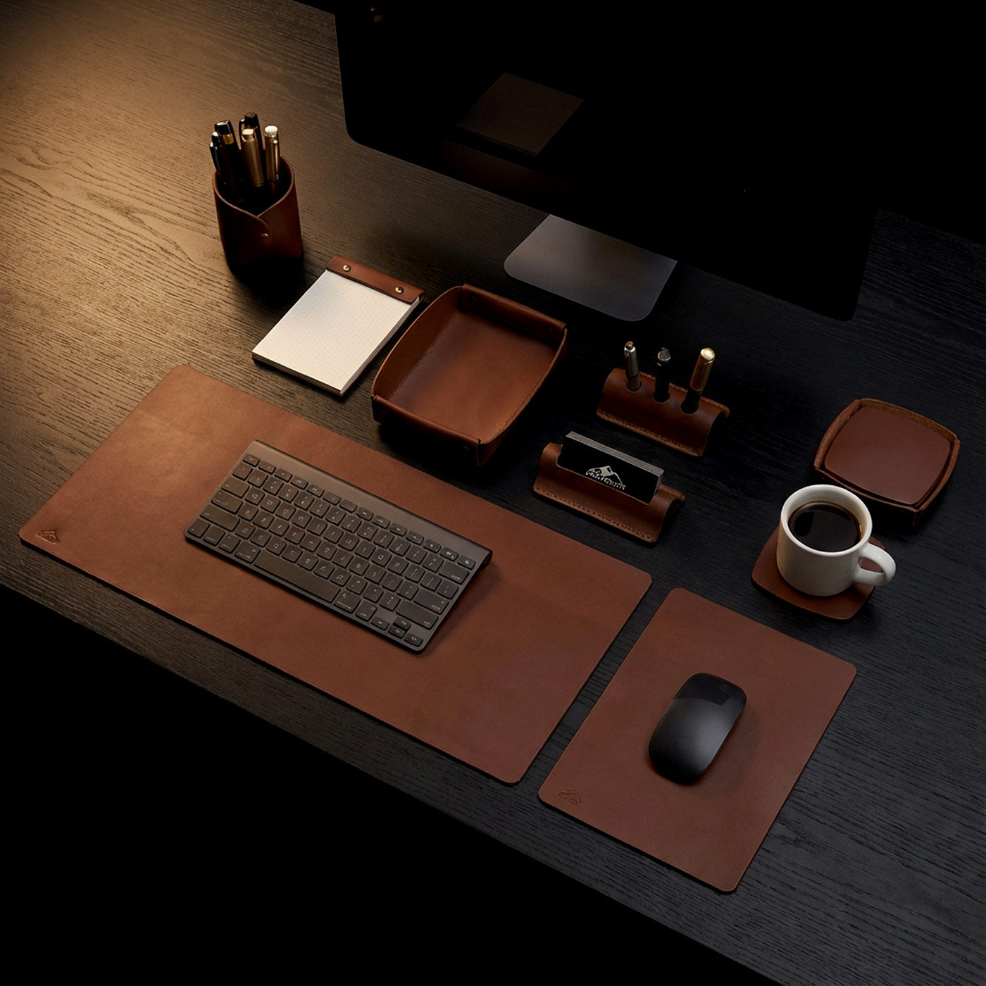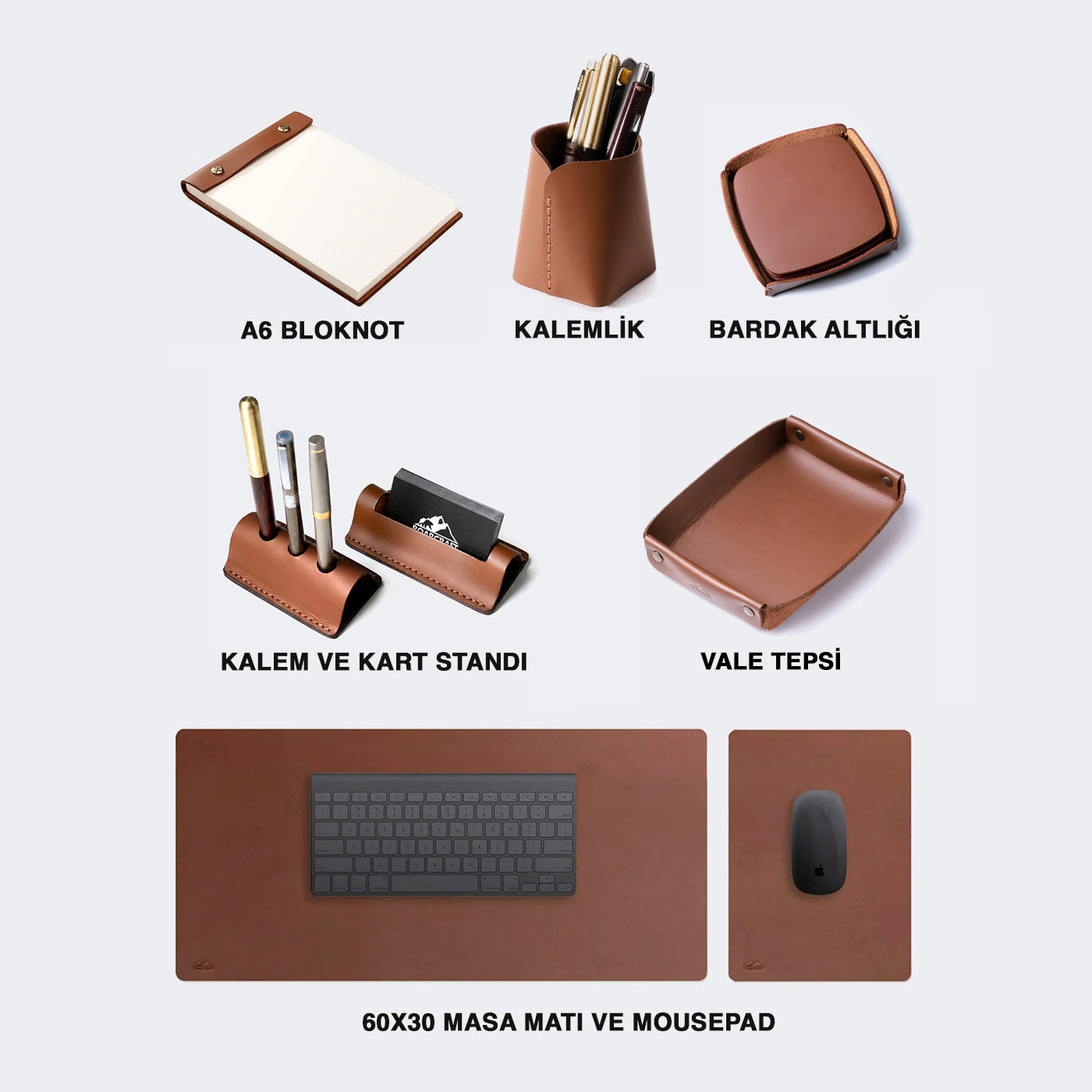 Kaliteli deriden el işçiliğiyle üretilmiş bu lüks masa seti, çalışma alanınızı hem düzenler hem de karakter kazandırır. Masa matından kalem standına, vale tepsiden bardak altlıklarına kadar tüm parçalar birbiriyle uyumludur.