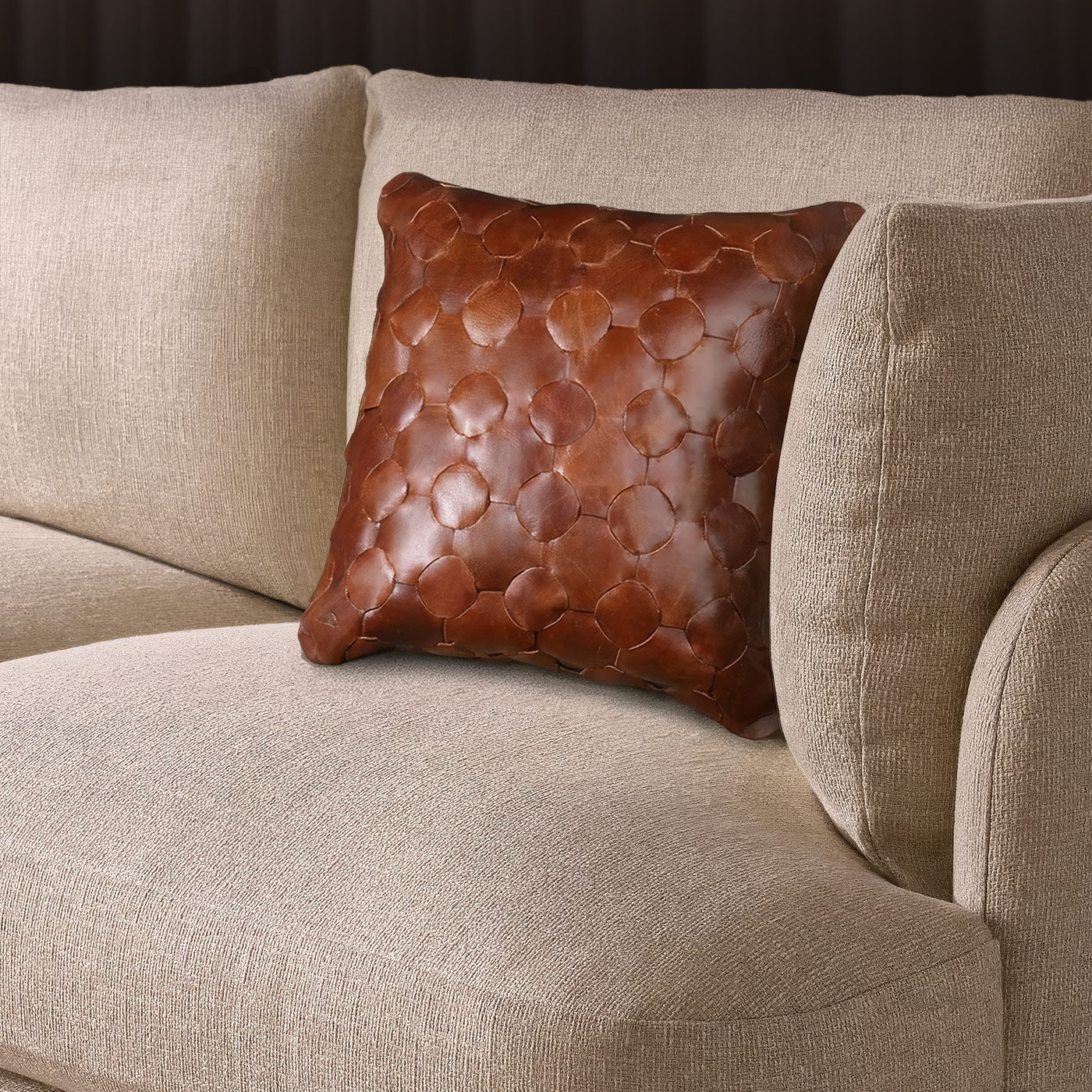 Anatolia ev dekoru koleksiyonunun özel bir parçası olan deri kırlent, patentli modüler kenetlenebilir tasarıma sahip yüzlerce deri parçanın tamamen elde örülerek birleştirilmesiyle üretilir.