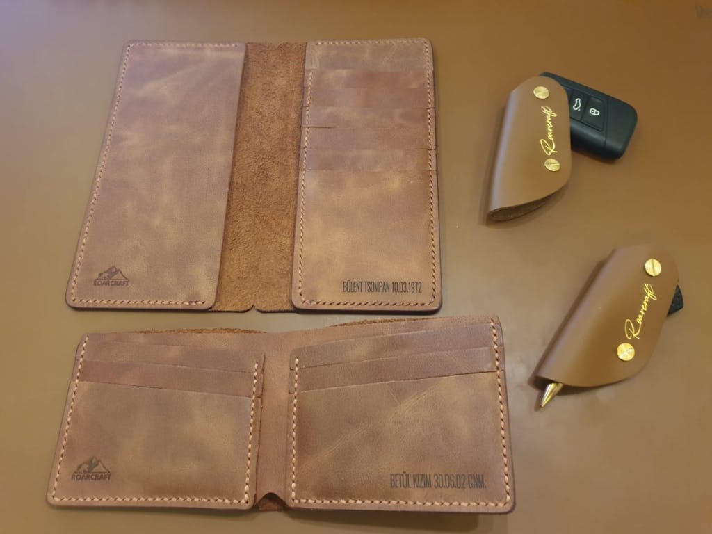 Cüzdanlar: Minimalist tasarımıyla dikkat çeken bu deri cüzdanlar, hem zarif bir aksesuar hem de günlük hayatın ihtiyaçlarını karşılamak için ideal. Özellikle kişisel isim ve tarih detayı, bu ürünü tamamen kişisel hale getiriyor ve eşsiz bir hediye seçeneği sunuyor.