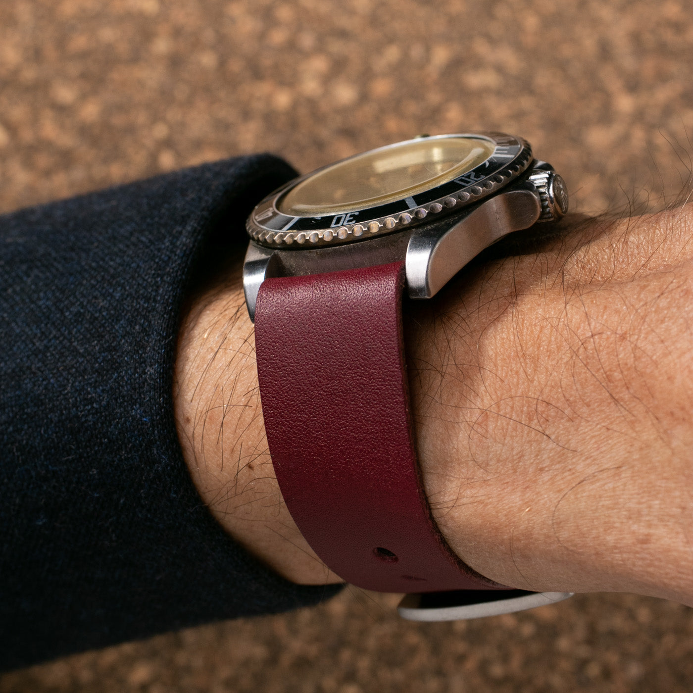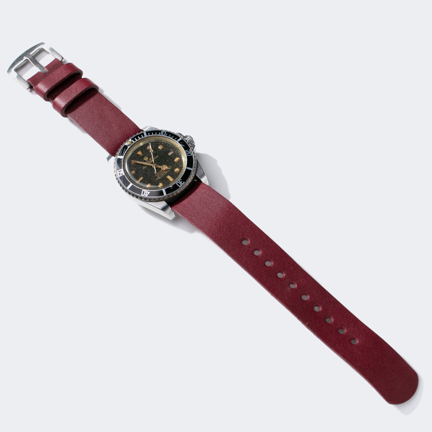 Bordo askeri deri nato saat kayışı ile şık saat tasarımı ve kayışın detayı