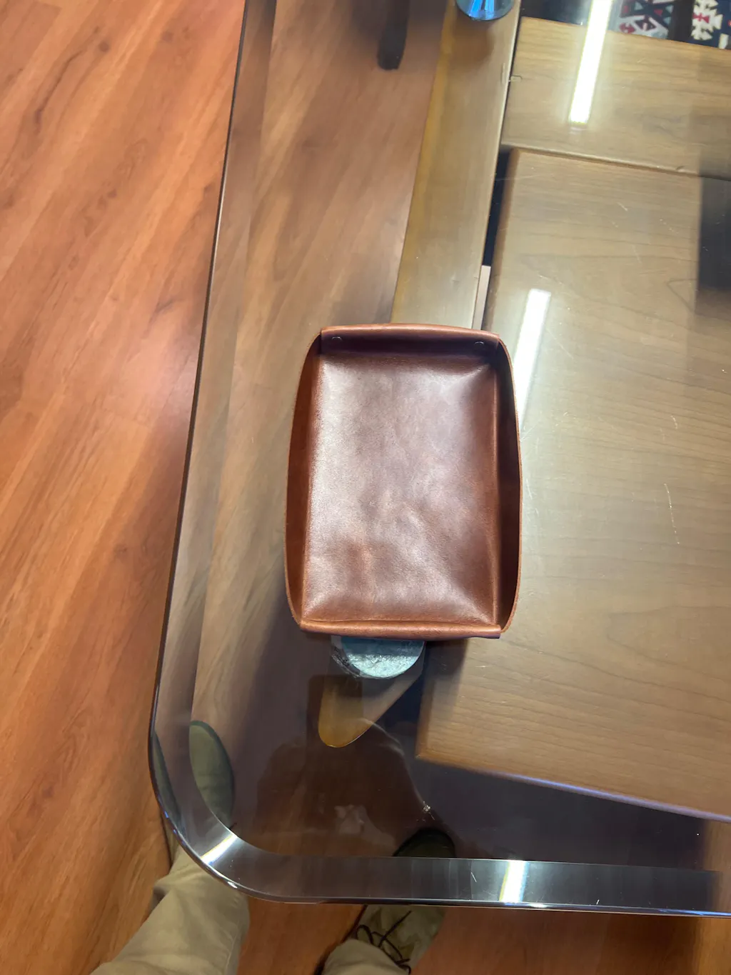 Minimalist bir tarza sahip deri tepsi modeli iki farklı boyutta tasarlandı.